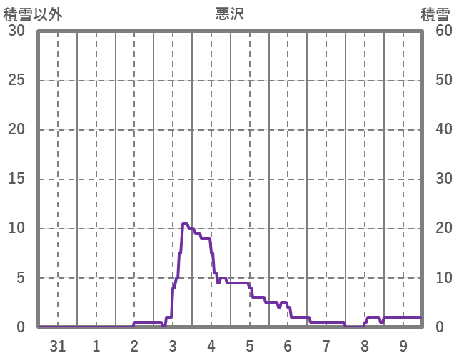 | 日 | 時 | 気温 | 降水 | 風向/風速 | 日照 | 積雪 | 降雪 |