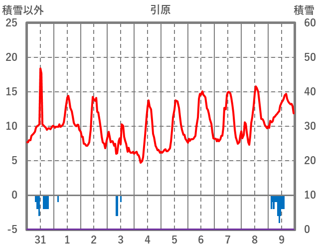 | 日 | 時 | 気温 | 降水 | 風向/風速 | 日照 | 積雪 | 降雪 |