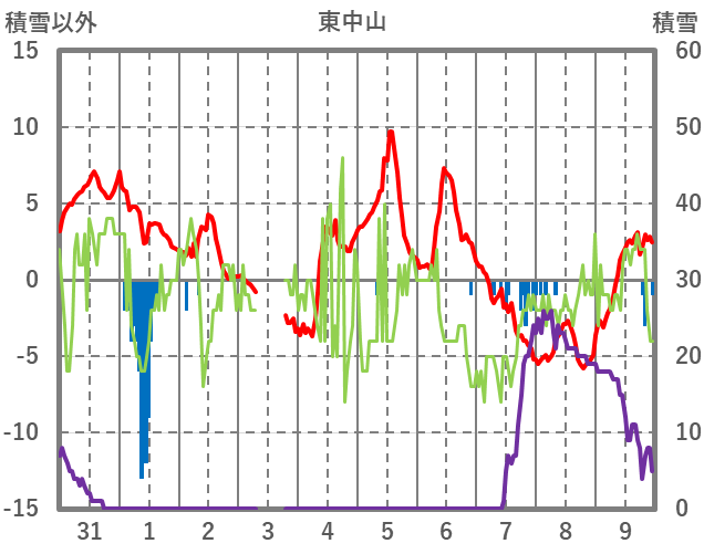 | 日 | 時 | 気温 | 降水 | 風向/風速 | 日照 | 積雪 | 降雪 |