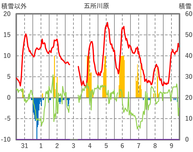 | 日 | 時 | 気温 | 降水 | 風向/風速 | 日照 | 積雪 | 降雪 |