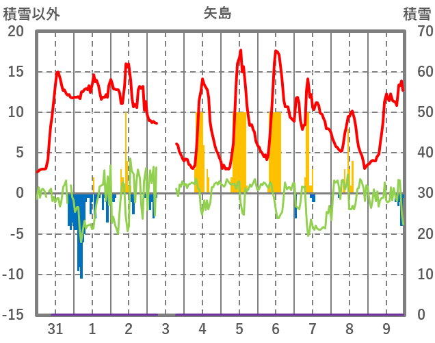 | 日 | 時 | 気温 | 降水 | 風向/風速 | 日照 | 積雪 | 降雪 |