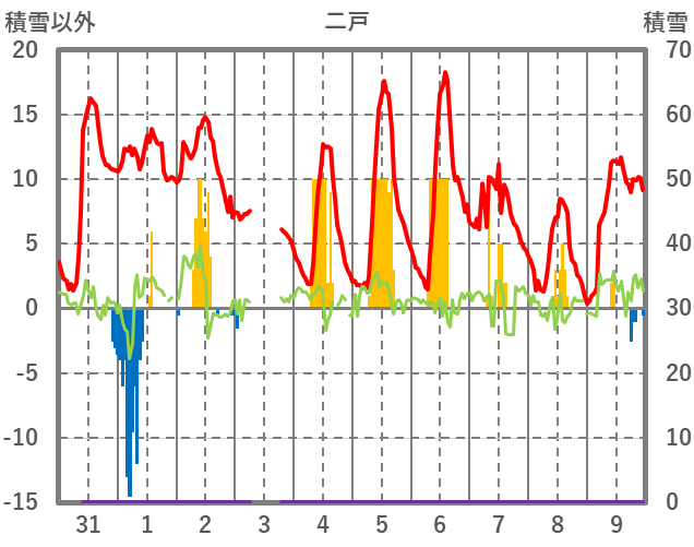| 日 | 時 | 気温 | 降水 | 風向/風速 | 日照 | 積雪 | 降雪 |