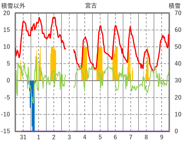 | 日 | 時 | 気温 | 降水 | 風向/風速 | 日照 | 積雪 | 降雪 |