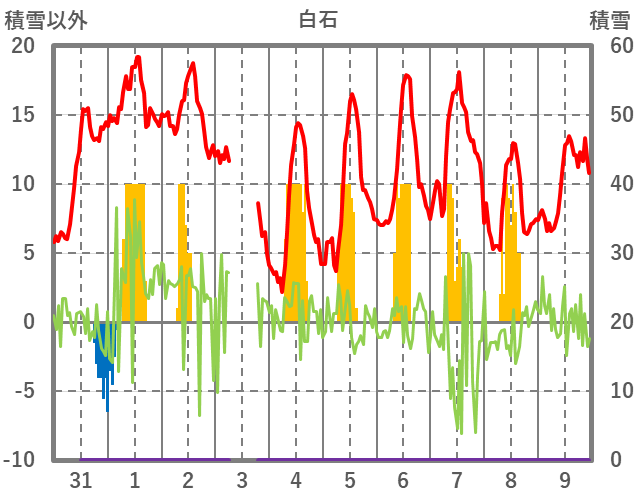 | 日 | 時 | 気温 | 降水 | 風向/風速 | 日照 | 積雪 | 降雪 |