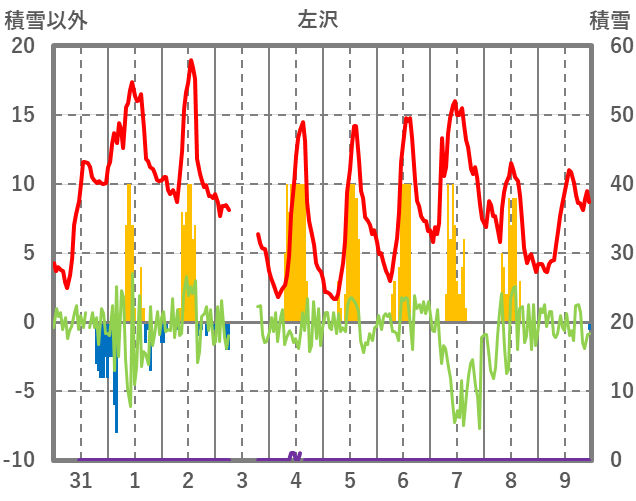 | 日 | 時 | 気温 | 降水 | 風向/風速 | 日照 | 積雪 | 降雪 |