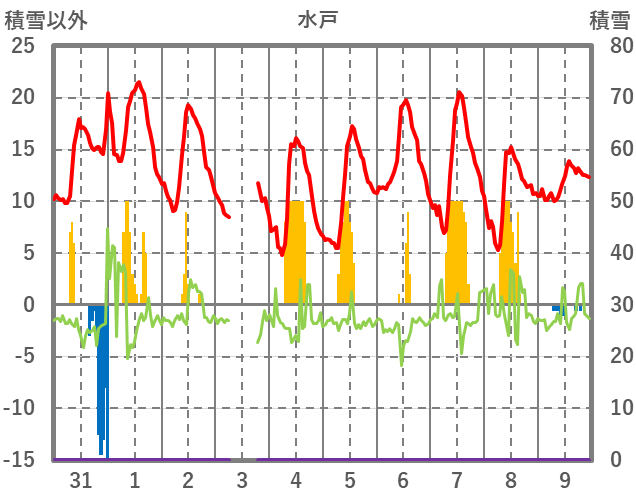 | 日 | 時 | 気温 | 降水 | 風向/風速 | 日照 | 積雪 | 降雪 |
