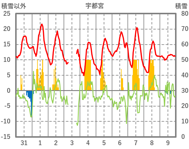 | 日 | 時 | 気温 | 降水 | 風向/風速 | 日照 | 積雪 | 降雪 |