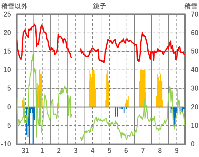 | 日 | 時 | 気温 | 降水 | 風向/風速 | 日照 | 積雪 | 降雪 |