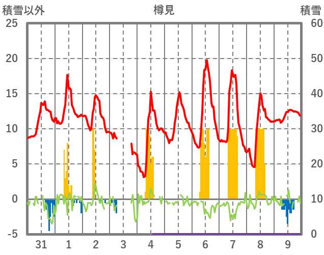 | 日 | 時 | 気温 | 降水 | 風向/風速 | 日照 | 積雪 | 降雪 |