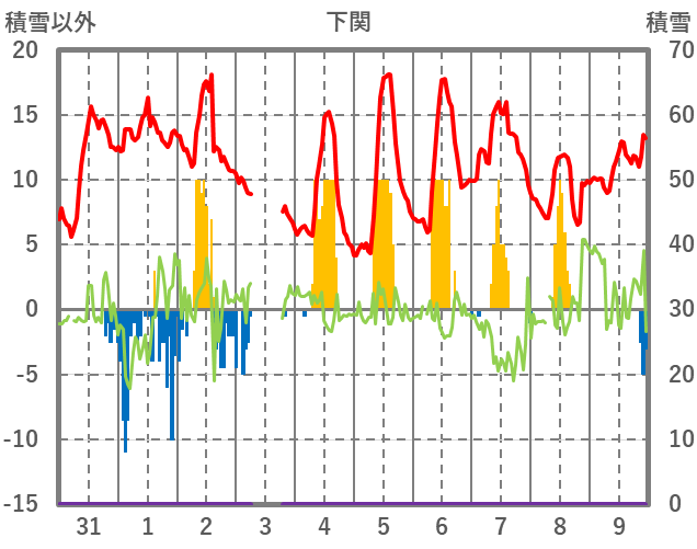 | 日 | 時 | 気温 | 降水 | 風向/風速 | 日照 | 積雪 | 降雪 |