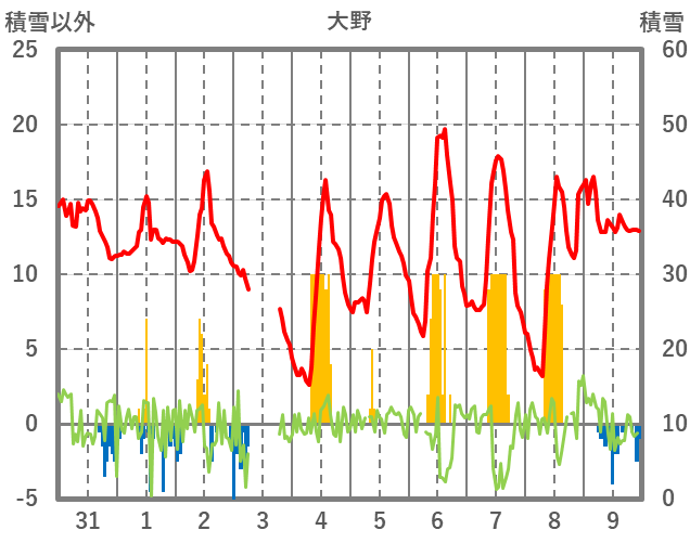 | 日 | 時 | 気温 | 降水 | 風向/風速 | 日照 | 積雪 | 降雪 |