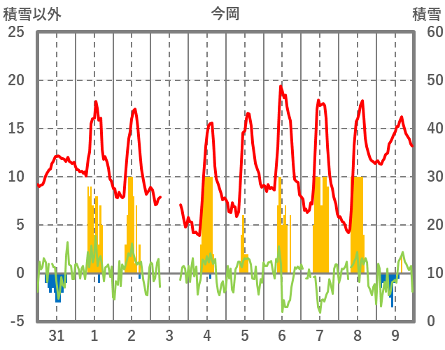 | 日 | 時 | 気温 | 降水 | 風向/風速 | 日照 | 積雪 | 降雪 |