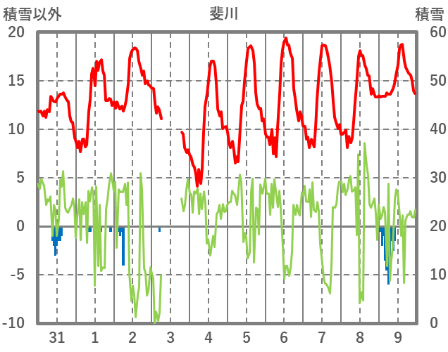 | 日 | 時 | 気温 | 降水 | 風向/風速 | 日照 | 積雪 | 降雪 |