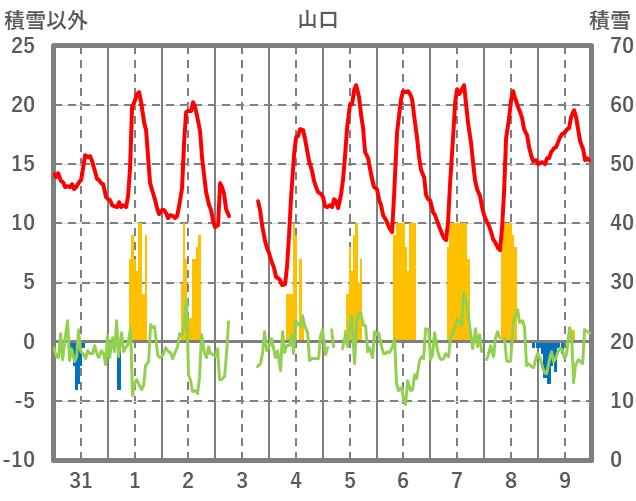 | 日 | 時 | 気温 | 降水 | 風向/風速 | 日照 | 積雪 | 降雪 |