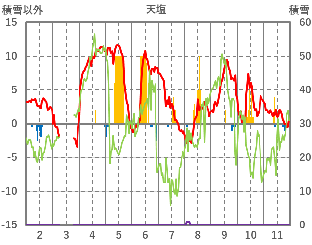 | 日 | 時 | 気温 | 降水 | 風向/風速 | 日照 | 積雪 | 降雪 |
