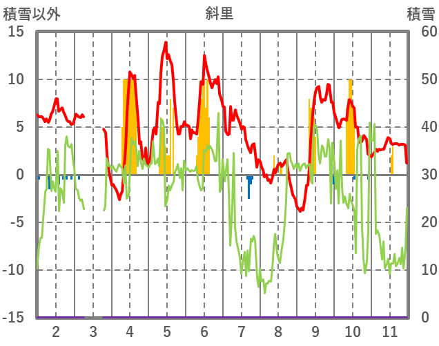 | 日 | 時 | 気温 | 降水 | 風向/風速 | 日照 | 積雪 | 降雪 |