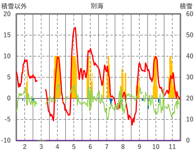| 日 | 時 | 気温 | 降水 | 風向/風速 | 日照 | 積雪 | 降雪 |