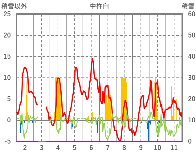 | 日 | 時 | 気温 | 降水 | 風向/風速 | 日照 | 積雪 | 降雪 |