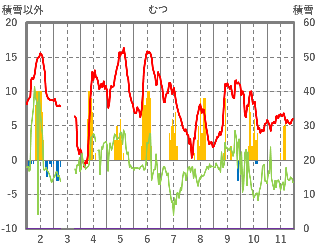 | 日 | 時 | 気温 | 降水 | 風向/風速 | 日照 | 積雪 | 降雪 |