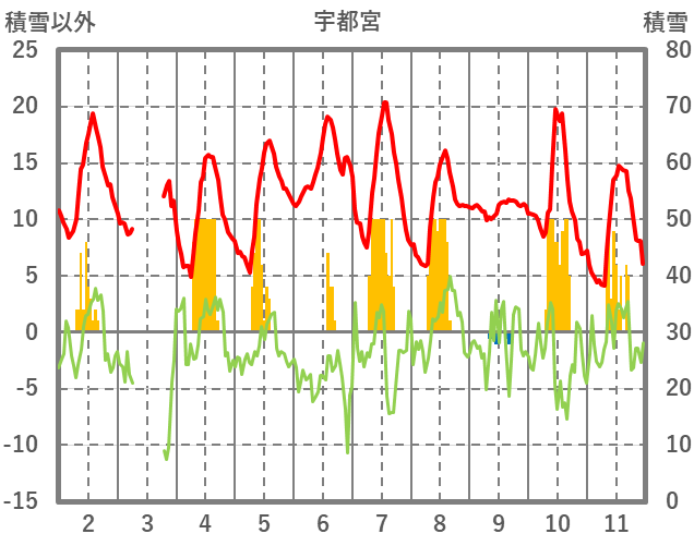 | 日 | 時 | 気温 | 降水 | 風向/風速 | 日照 | 積雪 | 降雪 |