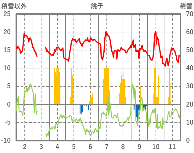 | 日 | 時 | 気温 | 降水 | 風向/風速 | 日照 | 積雪 | 降雪 |