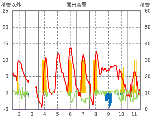 | 日 | 時 | 気温 | 降水 | 風向/風速 | 日照 | 積雪 | 降雪 |