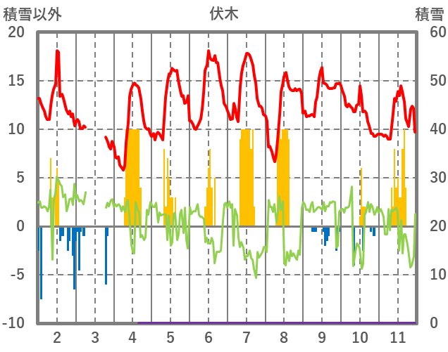 | 日 | 時 | 気温 | 降水 | 風向/風速 | 日照 | 積雪 | 降雪 |