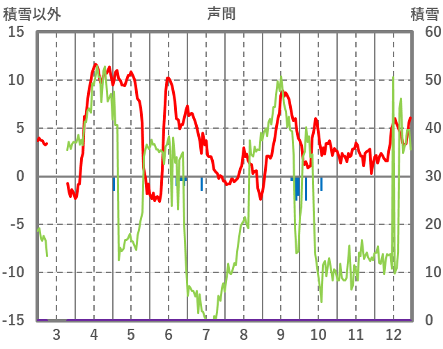 | 日 | 時 | 気温 | 降水 | 風向/風速 | 日照 | 積雪 | 降雪 |