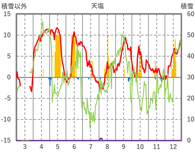 | 日 | 時 | 気温 | 降水 | 風向/風速 | 日照 | 積雪 | 降雪 |