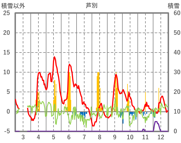 | 日 | 時 | 気温 | 降水 | 風向/風速 | 日照 | 積雪 | 降雪 |
