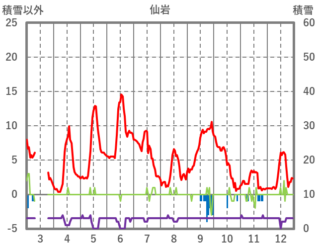 | 日 | 時 | 気温 | 降水 | 風向/風速 | 日照 | 積雪 | 降雪 |