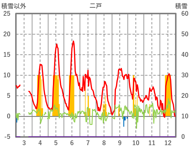 | 日 | 時 | 気温 | 降水 | 風向/風速 | 日照 | 積雪 | 降雪 |