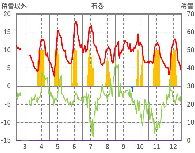 | 日 | 時 | 気温 | 降水 | 風向/風速 | 日照 | 積雪 | 降雪 |