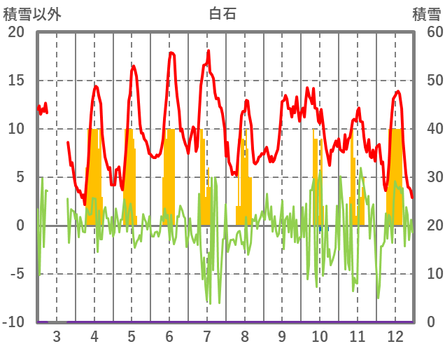 | 日 | 時 | 気温 | 降水 | 風向/風速 | 日照 | 積雪 | 降雪 |