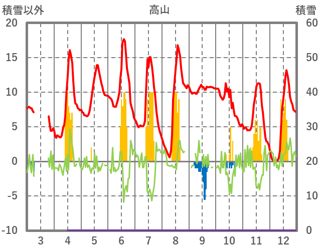 | 日 | 時 | 気温 | 降水 | 風向/風速 | 日照 | 積雪 | 降雪 |