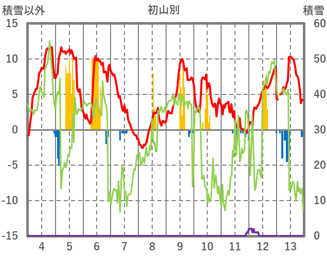 | 日 | 時 | 気温 | 降水 | 風向/風速 | 日照 | 積雪 | 降雪 |