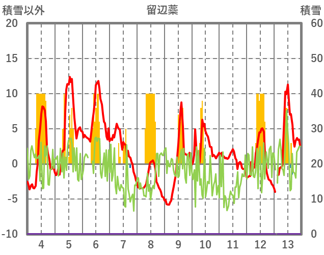 | 日 | 時 | 気温 | 降水 | 風向/風速 | 日照 | 積雪 | 降雪 |