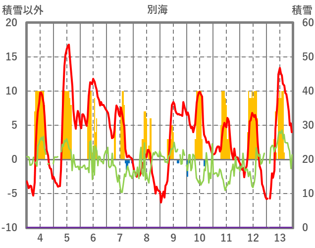 | 日 | 時 | 気温 | 降水 | 風向/風速 | 日照 | 積雪 | 降雪 |