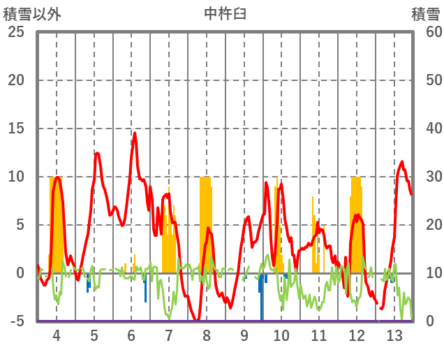 | 日 | 時 | 気温 | 降水 | 風向/風速 | 日照 | 積雪 | 降雪 |