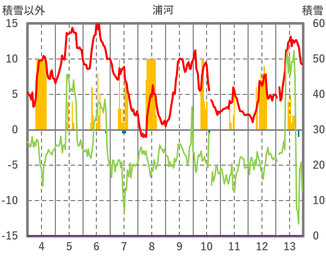 | 日 | 時 | 気温 | 降水 | 風向/風速 | 日照 | 積雪 | 降雪 |