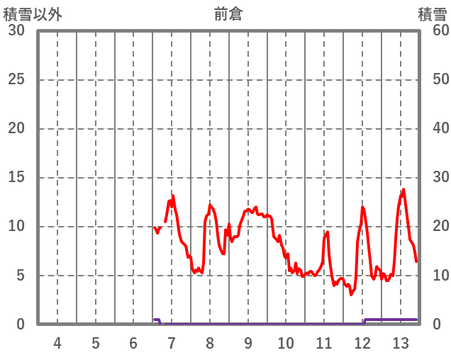 | 日 | 時 | 気温 | 降水 | 風向/風速 | 日照 | 積雪 | 降雪 |