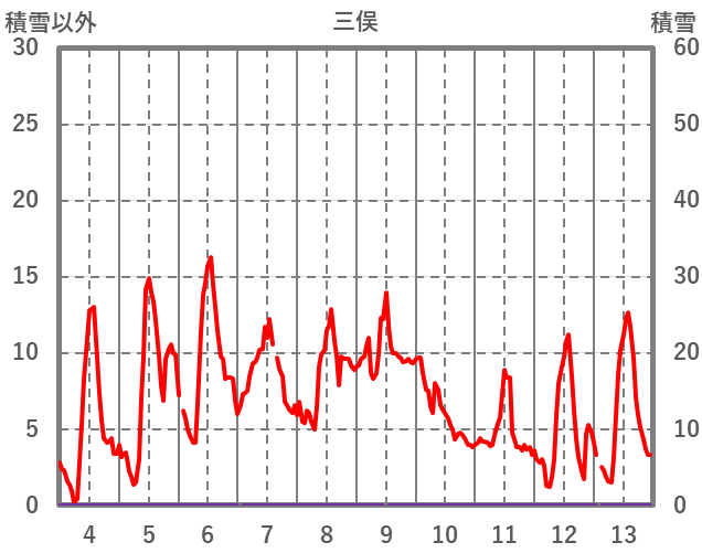 | 日 | 時 | 気温 | 降水 | 風向/風速 | 日照 | 積雪 | 降雪 |