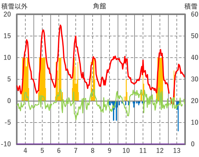 | 日 | 時 | 気温 | 降水 | 風向/風速 | 日照 | 積雪 | 降雪 |