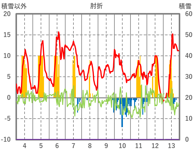 | 日 | 時 | 気温 | 降水 | 風向/風速 | 日照 | 積雪 | 降雪 |