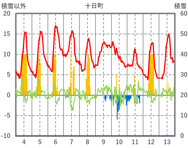 | 日 | 時 | 気温 | 降水 | 風向/風速 | 日照 | 積雪 | 降雪 |