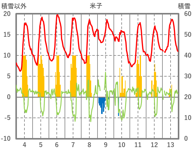| 日 | 時 | 気温 | 降水 | 風向/風速 | 日照 | 積雪 | 降雪 |