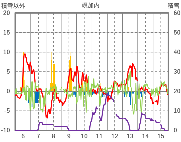 | 日 | 時 | 気温 | 降水 | 風向/風速 | 日照 | 積雪 | 降雪 |