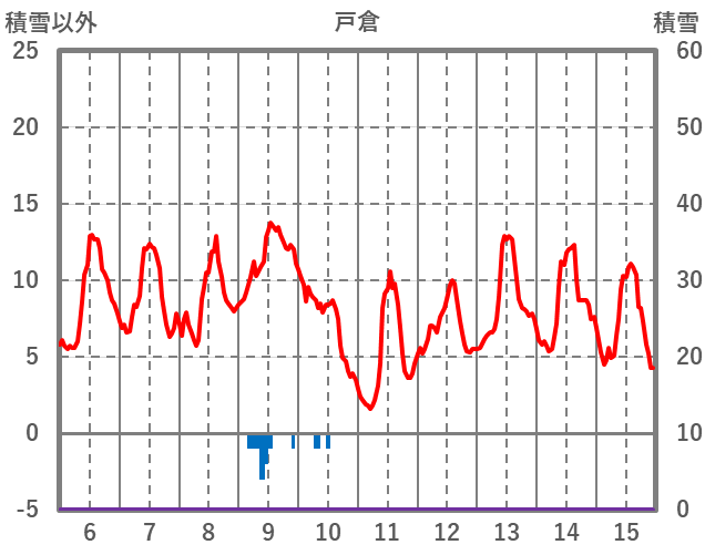 | 日 | 時 | 気温 | 降水 | 風向/風速 | 日照 | 積雪 | 降雪 |