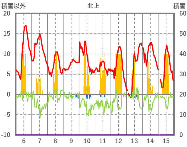 | 日 | 時 | 気温 | 降水 | 風向/風速 | 日照 | 積雪 | 降雪 |