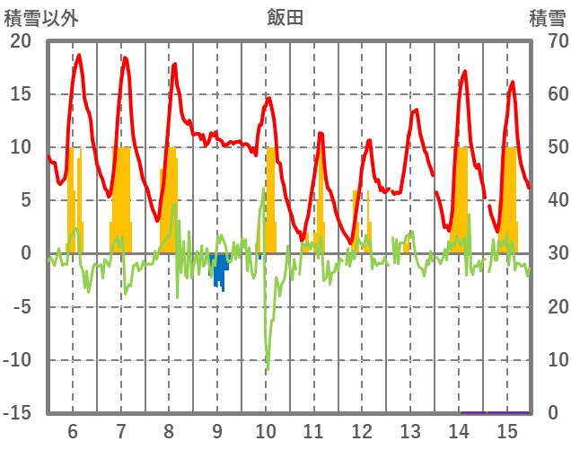 | 日 | 時 | 気温 | 降水 | 風向/風速 | 日照 | 積雪 | 降雪 |